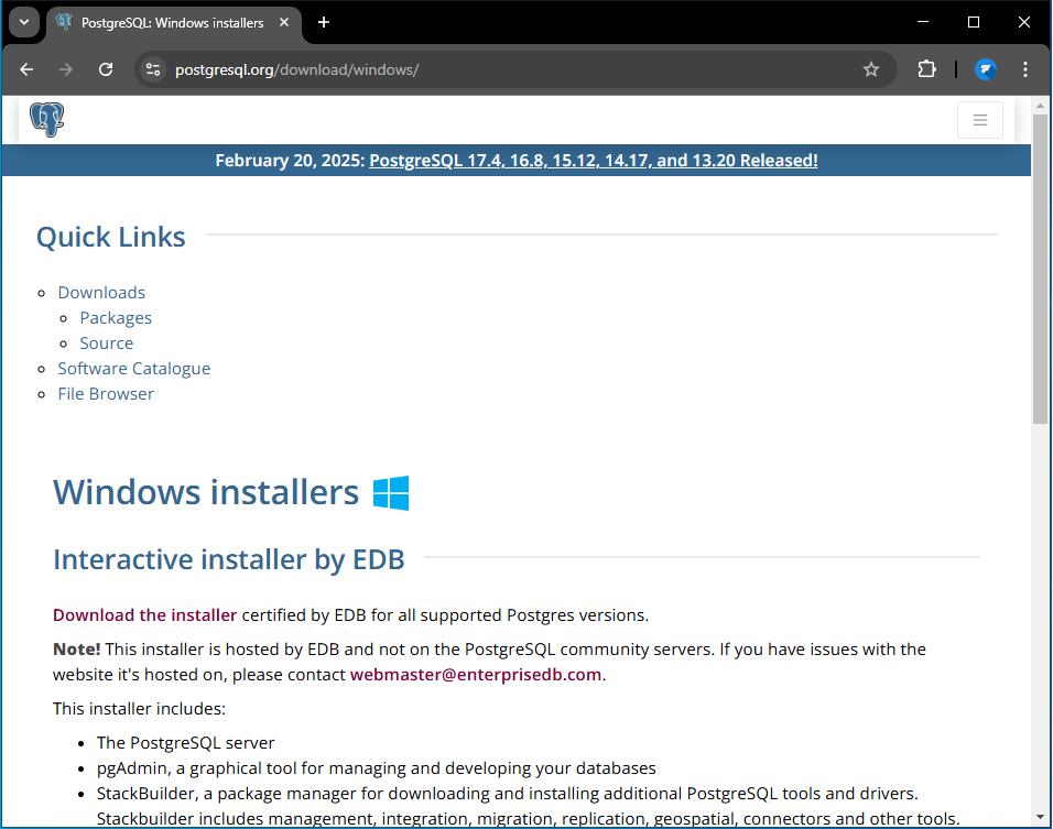 Nhấn vào "Download the installer" (Dòng dữ màu đỏ), bạn sẽ được chuyển đến trang của EnterpriseDB.
