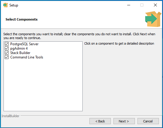 Chọn các thành phần cài đặt (nên chọn hết khi mới lần đầu làm quen với PostgreSQL):
