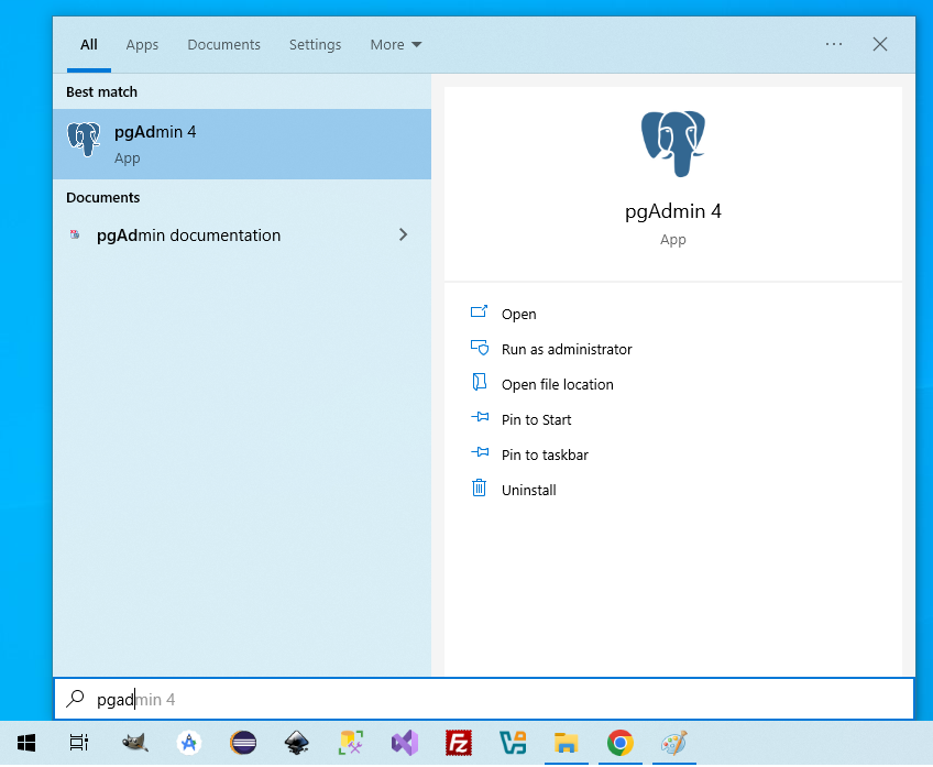 Để kiểm tra bạn có thực sự cài đặt thành công hay không. Bạn có thể tìm pgAdmin trong nút Windows như hình bên dưới.